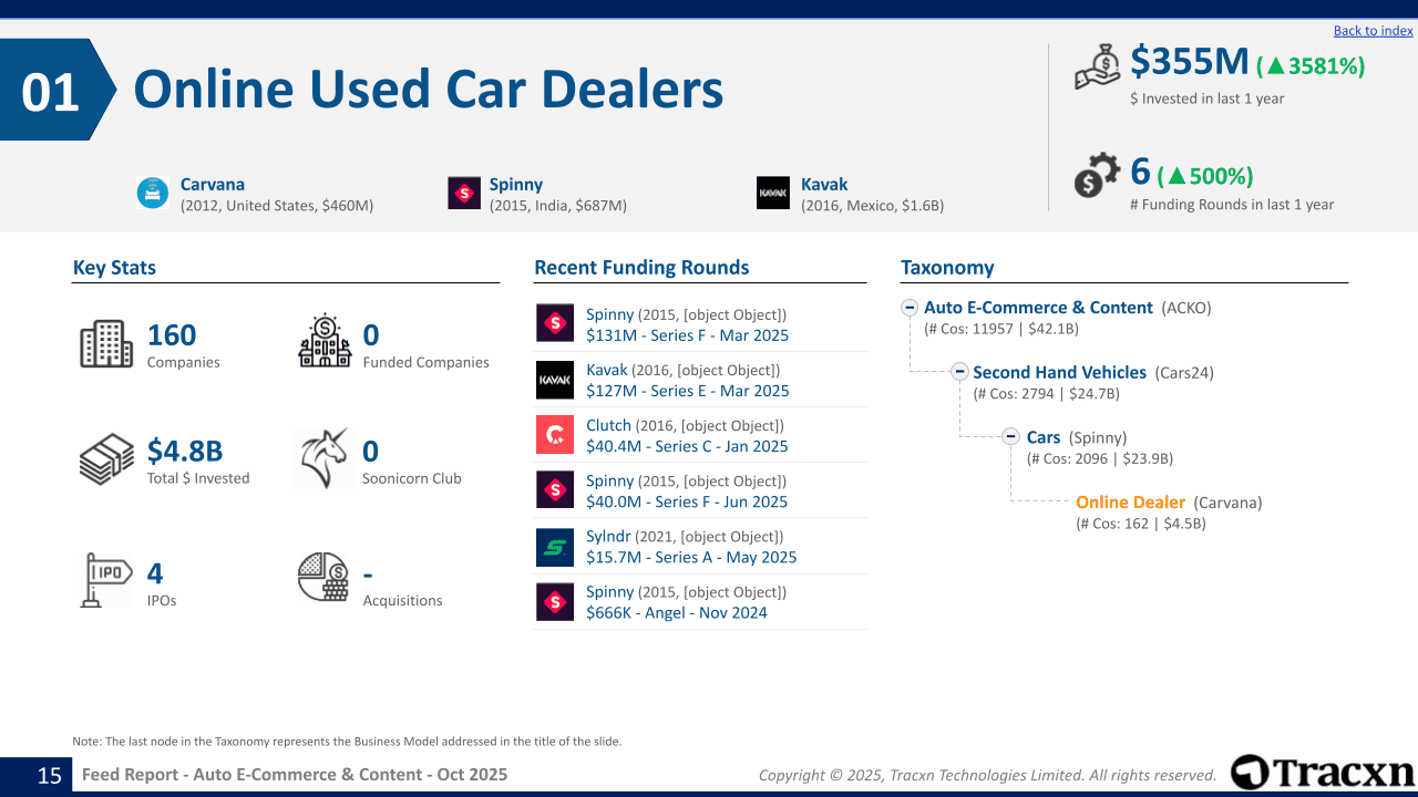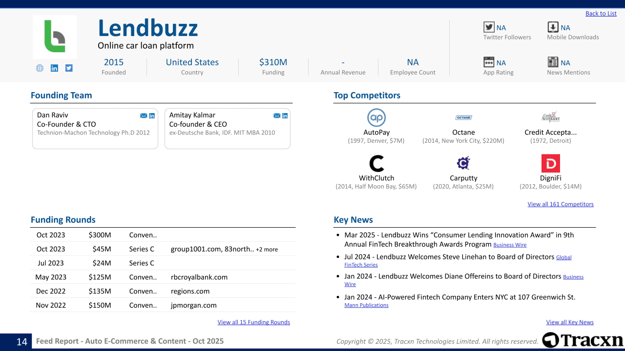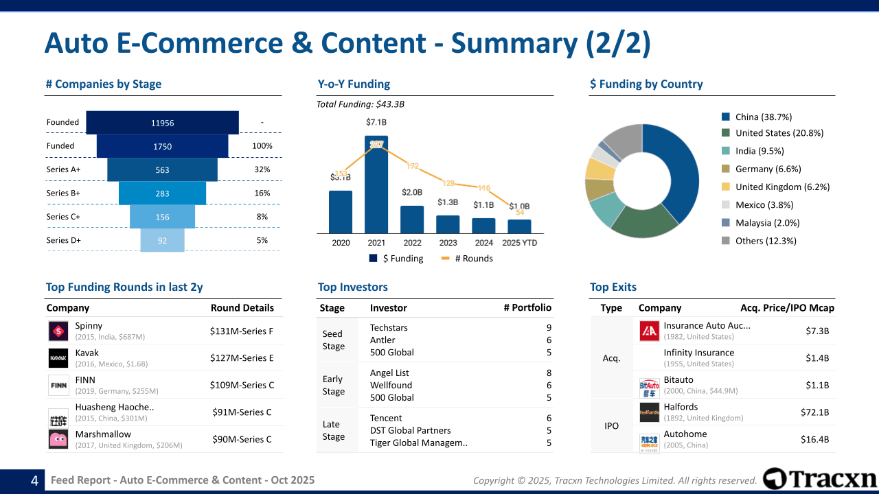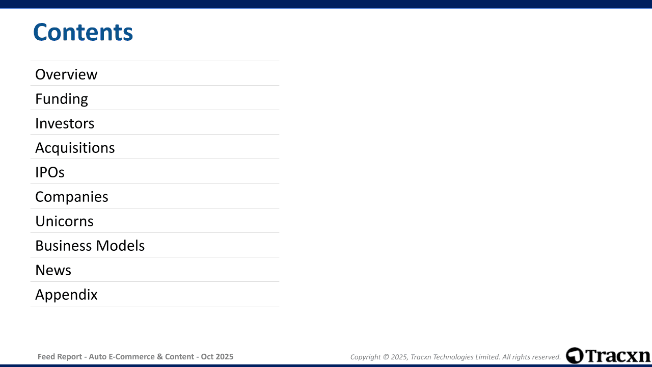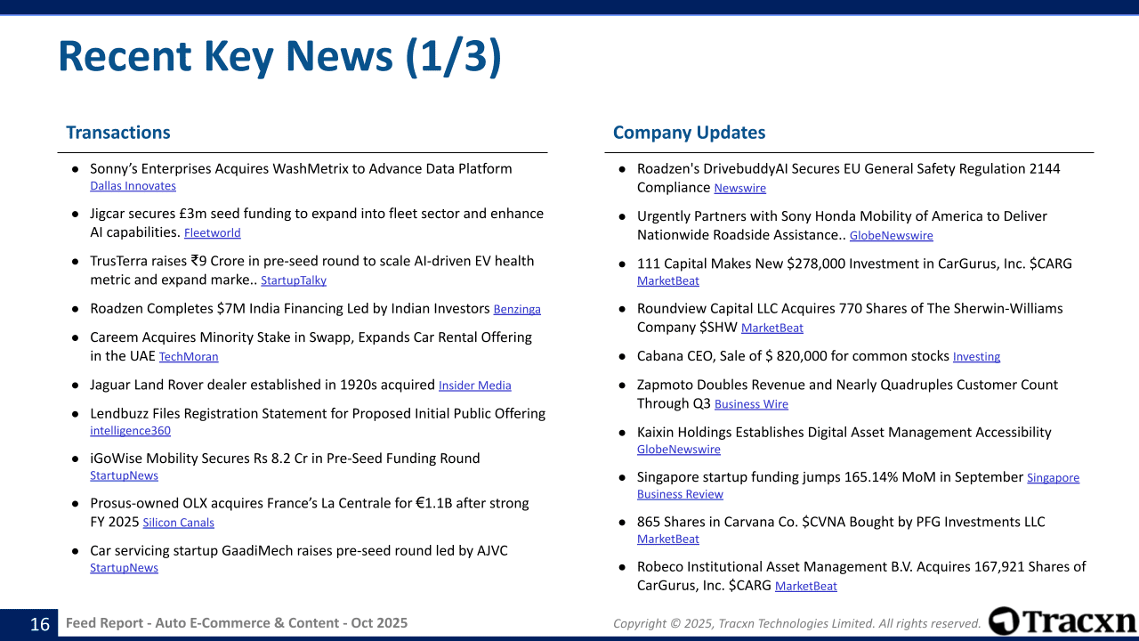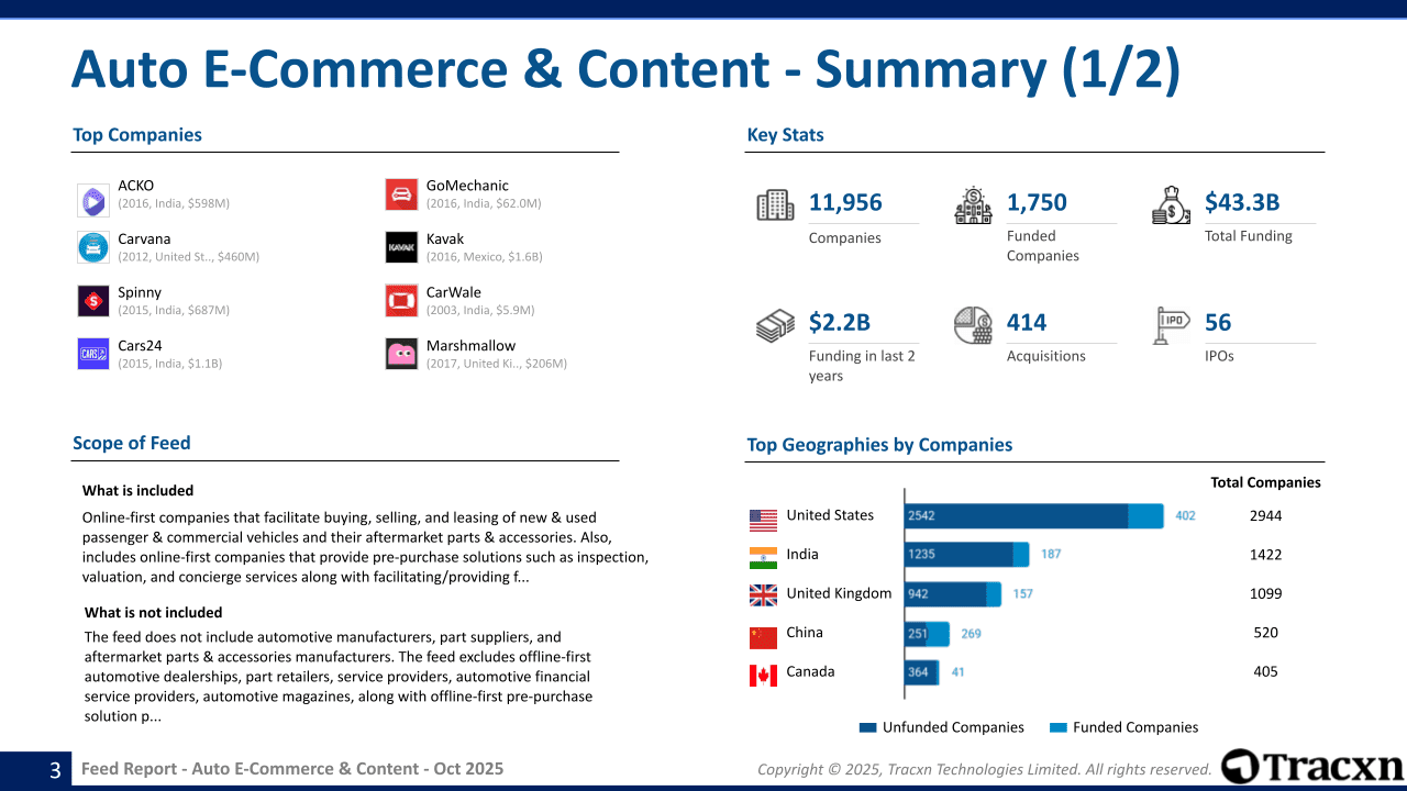 - Feed Scope: Online-first companies that facilitate buying, selling, and maintenance/repair of vehicles along with allied services like pre-purchase solutions, financial assistance, and automotive-related content.