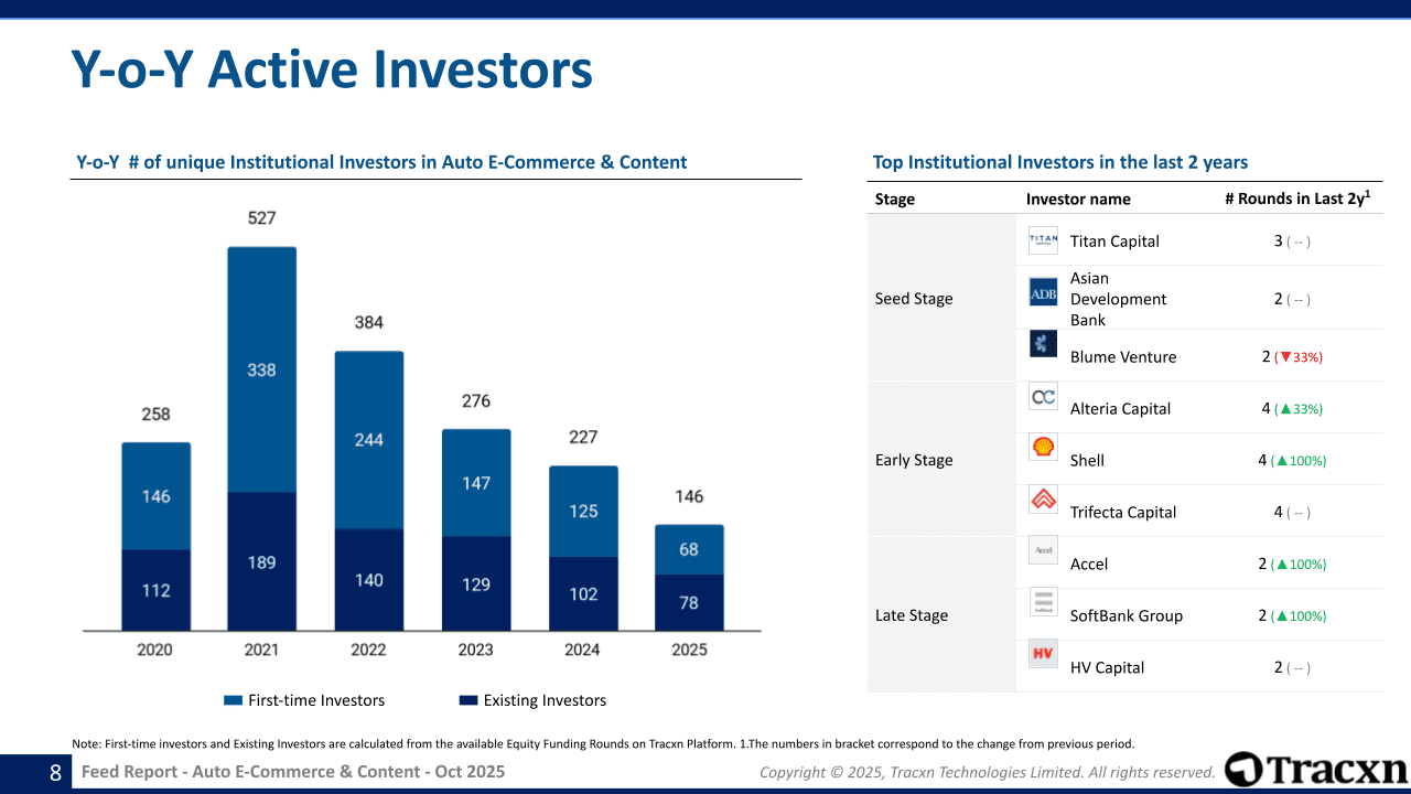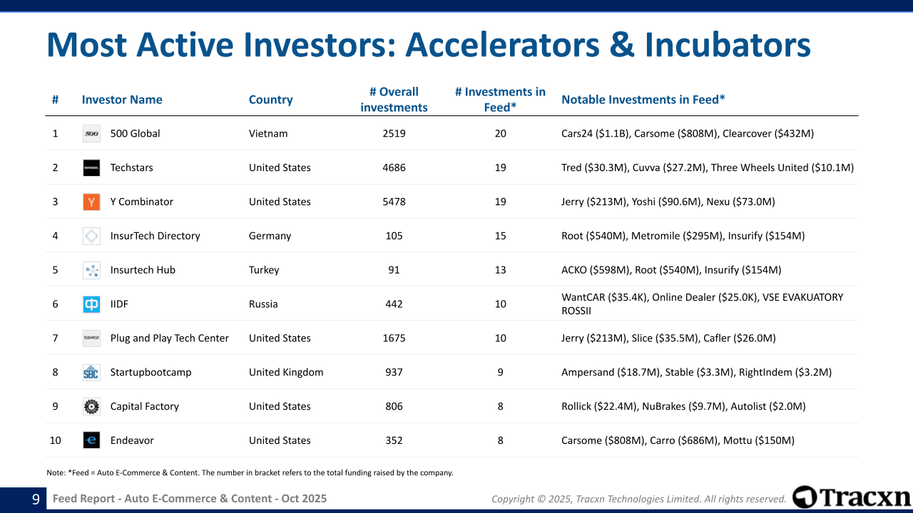 Recent noteworthy Investments in Auto E-Commerce & Content sector include:Most Active Investors