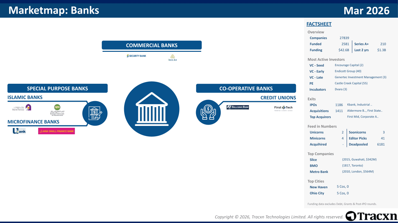 Out of the total 27,908 Banks companies, 2,606 have secured funding. Among them, 3,017 have reached Series A or higher, and 2,800 to Series B or beyond.