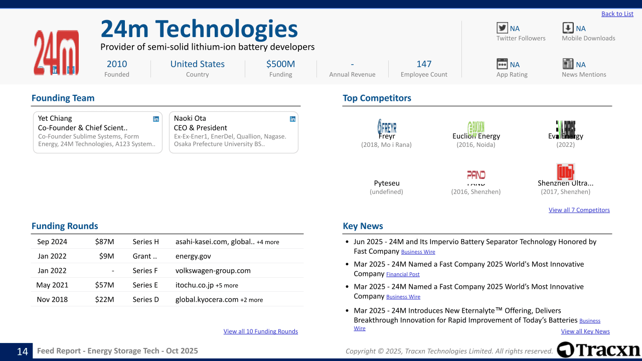 Recent noteworthy Investments in Energy Storage Tech sector include:- $463M, Series D round in Group14 Technologies on Aug 20, 2025