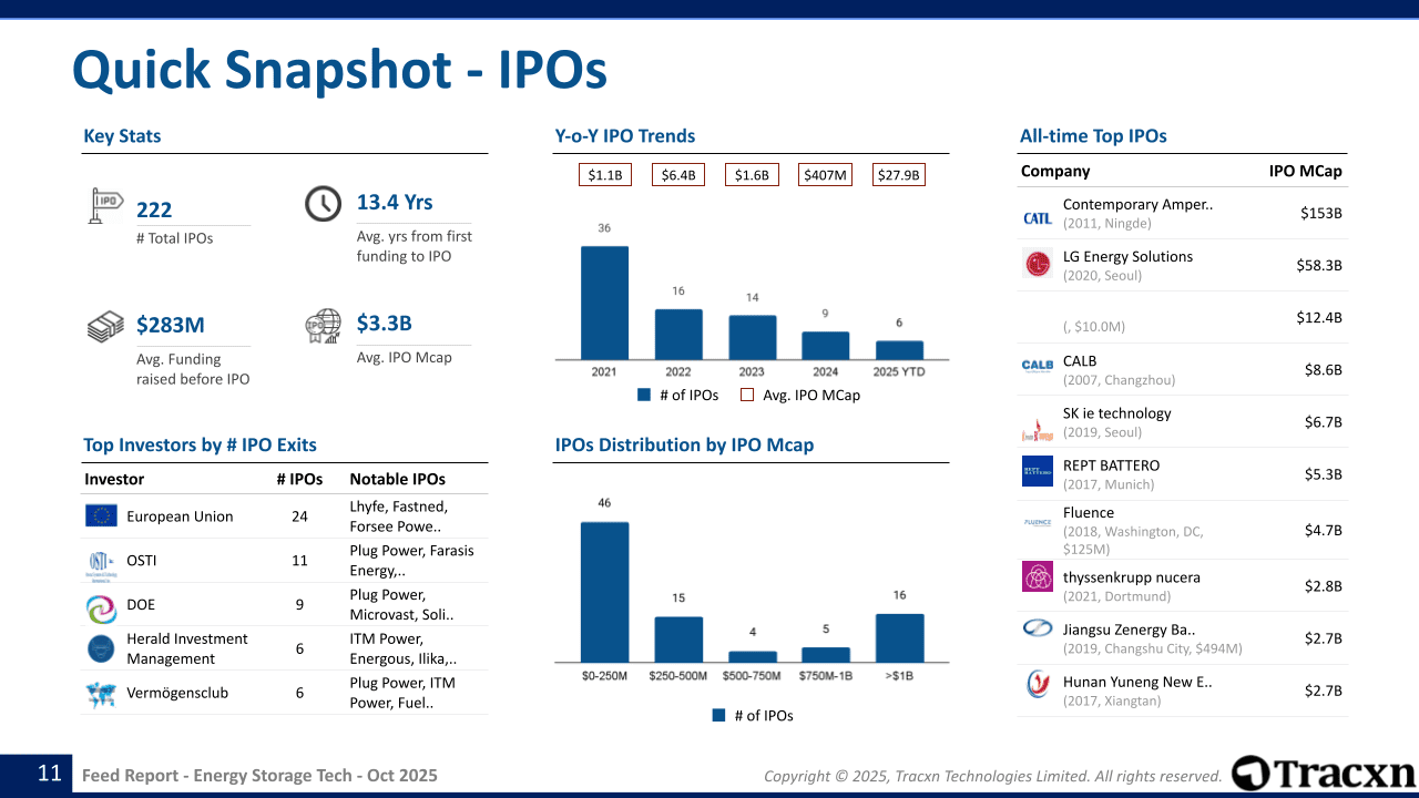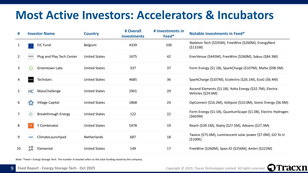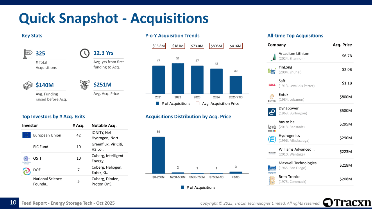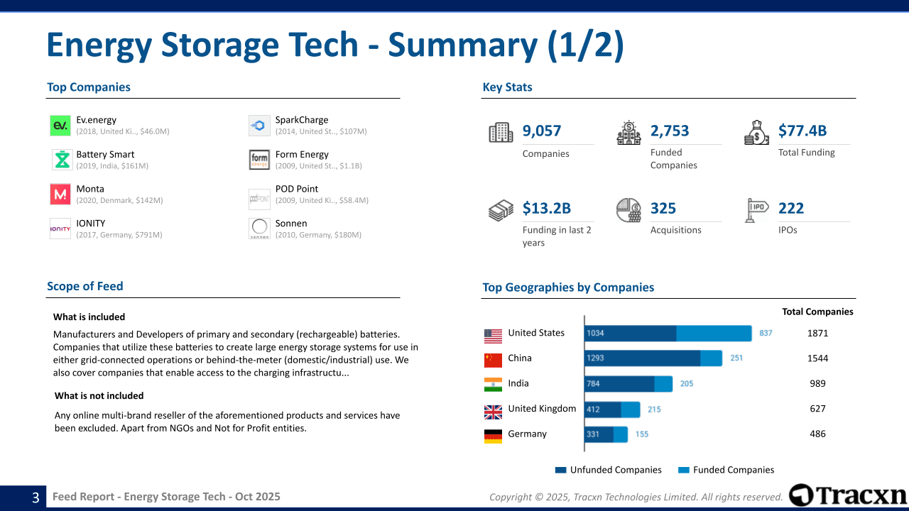 - Notable acquisitions in the Energy Storage Tech sector include Eco-movement being acquired by Dow Jones on Sep 18, 2025, Entek acquired by I Squared Capital on Sep 17, 2025 and BTR Energy acquired by EnergyHub on Sep 04, 2025.