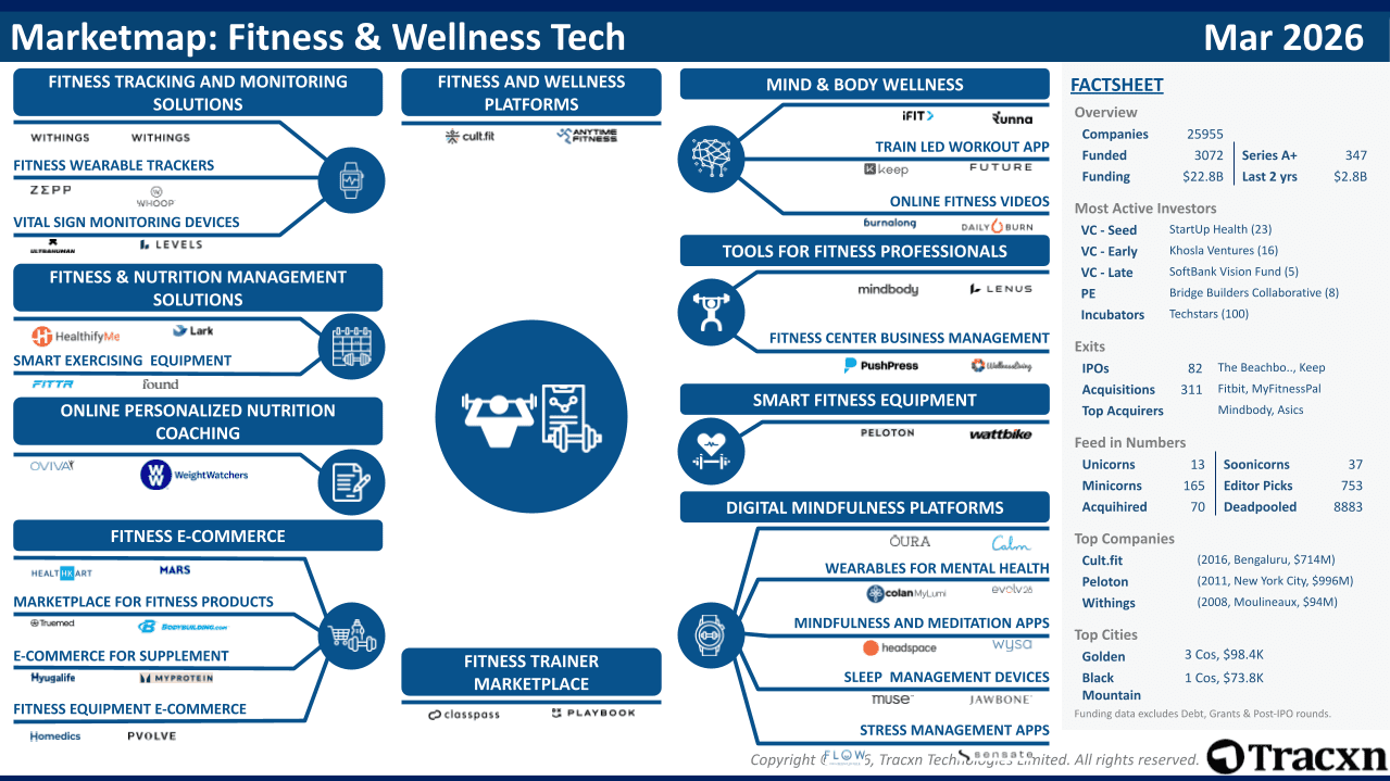 - Manufacturer of fitness retail products - Offline gym centers and franchisee like Gold's Gym - Fitness blogsMarket Map of Fitness & Wellness Tech