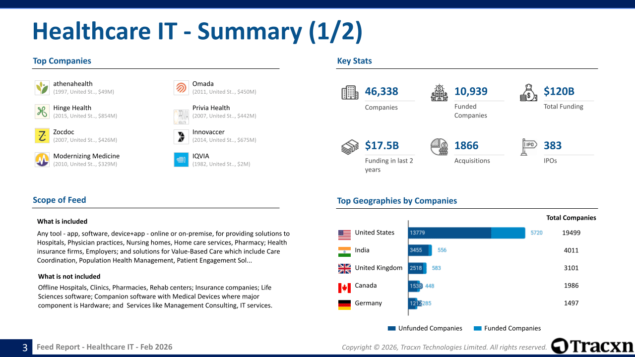 - Feed Scope: Healthcare IT includes enterprise facing software solutions (B2B or B2B2C) which help healthcare professionals and organizations like hospitals, pharmacies, health insurance companies, clinics and health systems in all the processes involved in Preventive care, Health care delivery, and Health care financing.