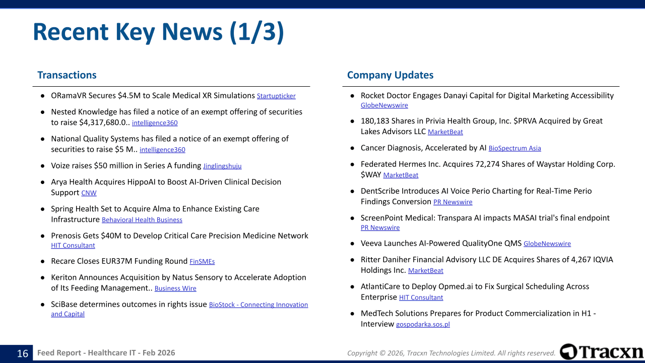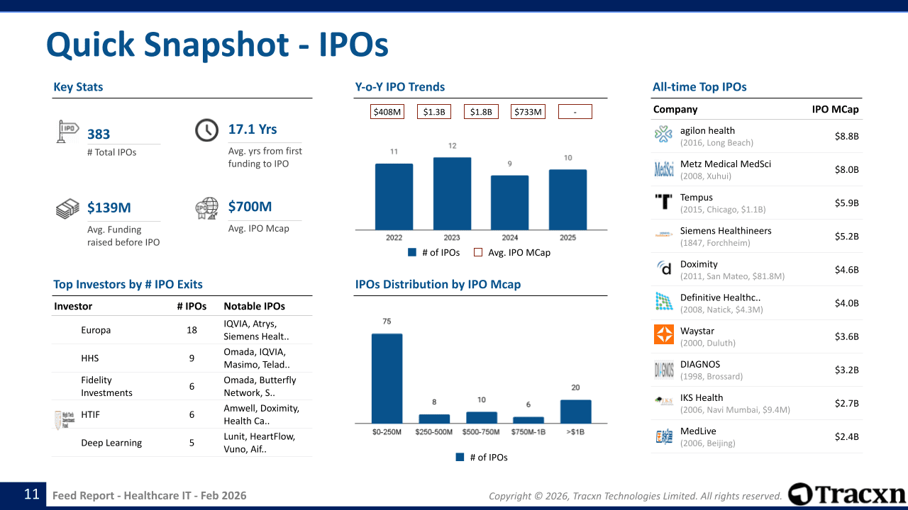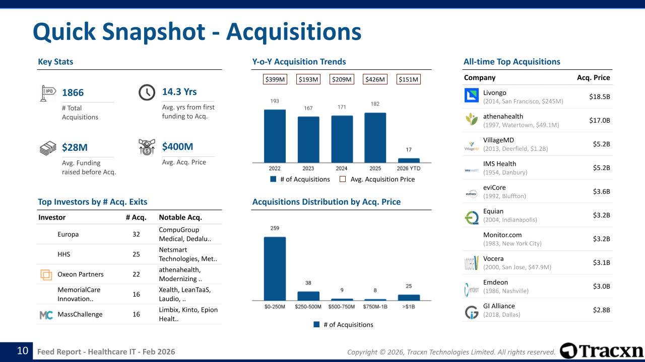 - Notable acquisitions in the Healthcare IT sector include Unbound Medicine being acquired by MPS on Jan 30, 2026, Kaia Health acquired by Sword Health on Jan 29, 2026 and Alma acquired by Spring Health on Jan 29, 2026.