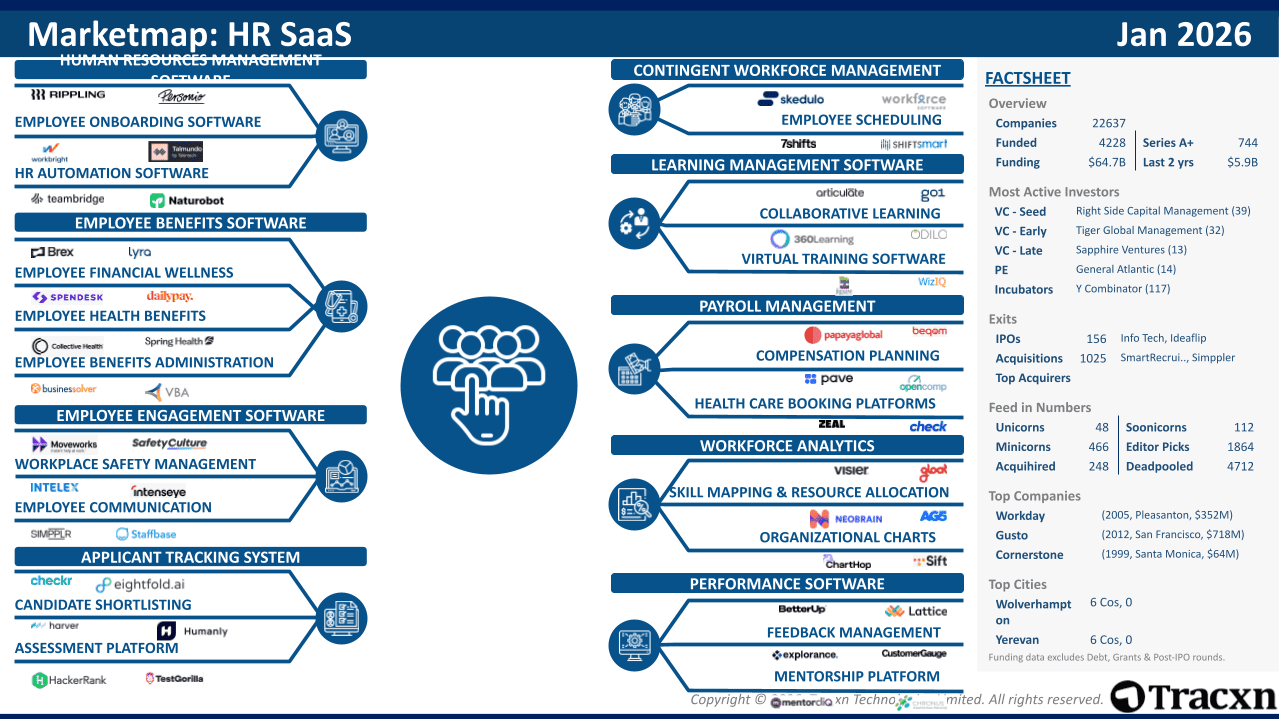 Cloud-based HRMS, Payroll, Employee Engagement, Job Boards, Marketplaces, Performance Management Tools, other HR-related softwareCompanies excluded in HR SaaS sector