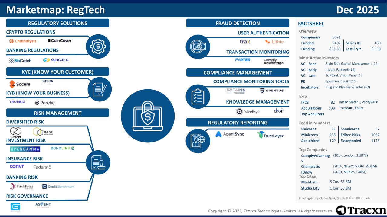 Companies offering KYC, AML & Fraud Detection, Risk Management, Compliance Management, Regulatory Reporting, and SupTech solutionsCompanies excluded in RegTech sector